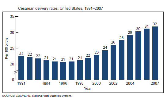 The National Center for Health Statistics released a new report today, Recent Trends in Cesarean Delivery in the United States. The report is most notable for a startling statistic; the C-section rate has reached the astronomical level of 32%, an increase of more than 50% since 1996. This is disturbing news.